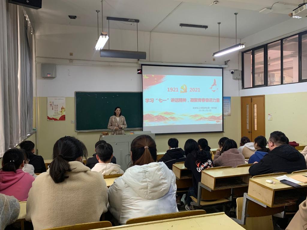 11月13日,化工学院学生第一党支部书记李慧在知行楼110,为支部全部全体党员上“学习‘七一’讲话精神,凝聚青春奋进力量”主题党课。