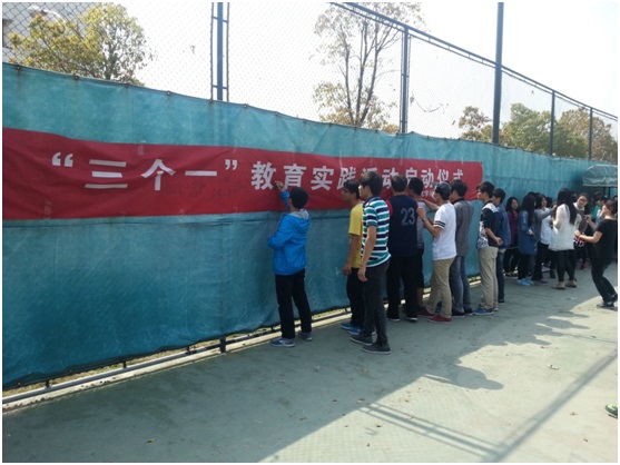 院党委副书记李刚发表重要讲话  院党委副书记宣布“三个一”教育实践活动正式启动  学生科科长李慧作出重要指导  “三个一”教育实践活动签字仪式