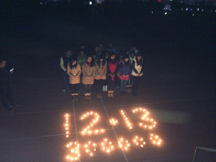 12月13日上午10点半,化生学院分团委在betway西汉姆联官网东校区移动营业厅门口举办了纪念“南京大屠杀死难者国家公祭日”的祭奠活动。 化生学院精心绘制了活动海报,并发动志愿者在活动前亲手制作白花和和平鸽。活动期间,化生学院展出海报展板,并将制作好的白花和和平鸽发给前来献花、贴和平鸽的学生,以祭奠在南京大屠杀事件中牺牲的30万死难者同胞。每一位前来祭奠的学生都抱着虔诚的心在展板上写下了“和平”,寄予了大家对和平的美好期望。 晚上7点,化生学院三十多名同学在操场为纪念南京大屠杀死难者同胞进行了烛光祭。化生学院发动志愿者将蜡烛摆放成“12.13”及“300000”的形状,寓意在12月13日国家公祭日当天对南京大屠杀30万遇难者的深切哀悼以及缅怀。三十多名同学面对着黑夜中摇曳的烛光肃立,双手合十进行默哀、沉思。最后,每一位同学手捧蜡烛,在铭记历史的同时,对未来许下美好的祝愿。