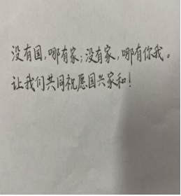 云寄语,深情祝福祖国。“祖国是东方的明珠,是亚洲腾飞的巨龙,是海平线上初升的太阳,祖国在你心中,在我心中,在每个人的心中”、“我爱你中国,亲爱的母亲,我为你自豪”、“弹奏出时代的最强音符,创造出一个又一个的奇迹,那就是你,我的祖国母亲,我高唱颂歌祝福你”。在2020520的特殊日期里,学院学生用最真挚的话语深情告白祖国,一个字,一份心愿;一句话,一份祝福。