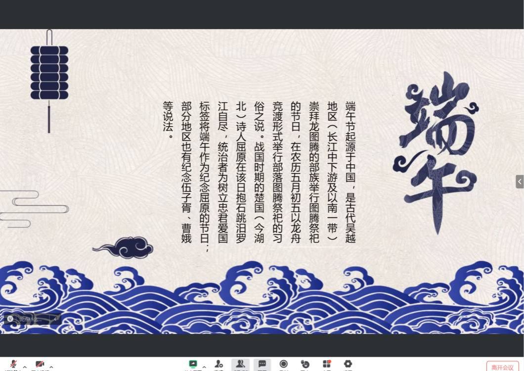 为了提高同学们对端午习俗的认知,增强对传统文化的认同感和对民族文化的自豪感,betway西汉姆联官网团委于6月10日晚上,组织团委全体学生干部在线上开展“品味端午,传承文化”的主题活动,共计60余人参加。