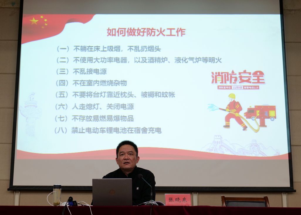 在安全主题报告中,张晓东从安全的概念入手,强调国家安全是安邦定国的基石,要求大学生能正确理解和把握总体国家安全观。以全国各地安全事故的频繁发生作为引入,针对财产、人身、消防、交通、食品、旅游等方面进行安全教育,提醒同学们在防盗、防骗等方面应加强安全知识的学习,同时向学生普及了“16个安全“,重点介绍了校园消防安全知识,要求同学遵守校园规定。