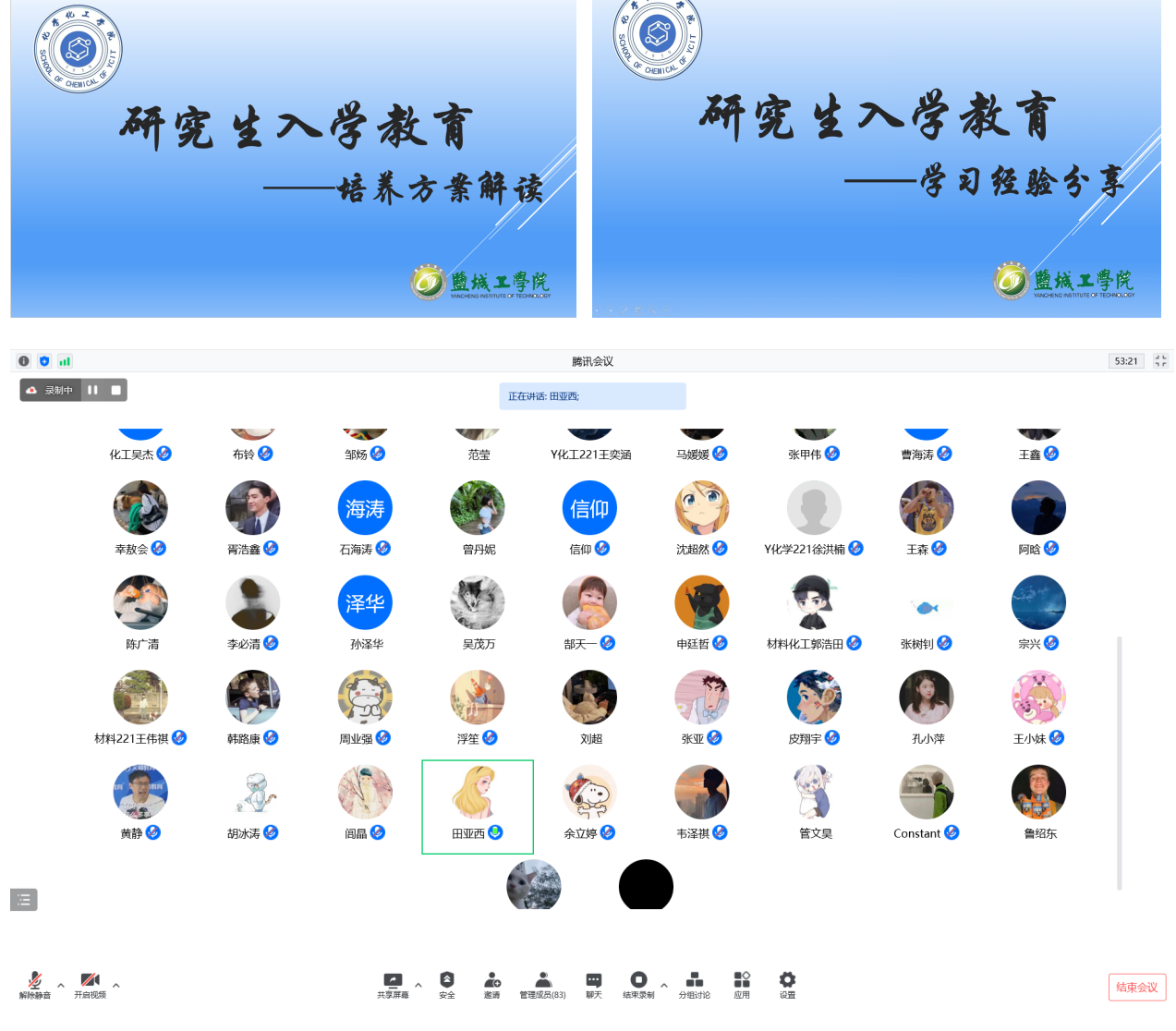 大会还邀请我院2019级化学工程与技术专业硕士研究生田亚西作为优秀学生代表进行交流分享。田亚西从从时间规划、如何看文献和常用科研软件等方面向大家交流学习心得;指出研究生三年是锻炼独立思考,培养科研思维的三年,更是日后步入工作,厚积薄发的三年!只要我们在这个过程中,坚守住自己的学术道德底线,严遵学术规范,终究会柳暗花明,静待花开。
