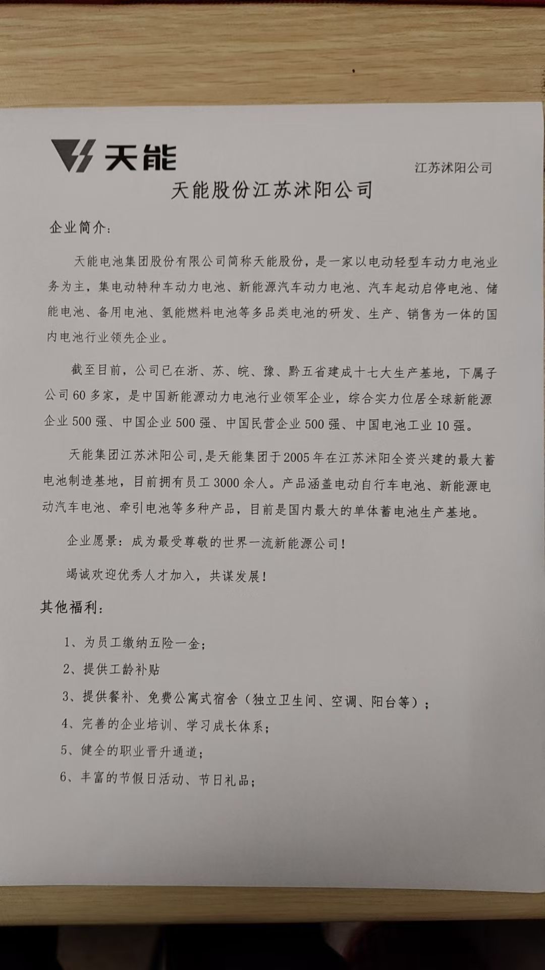 天能股份江苏沭阳公司招聘简章