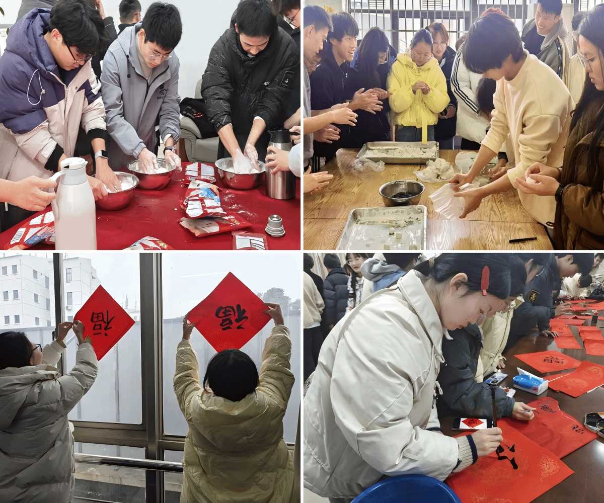 同学们在活动现场的长桌上摆放好纸墨,开展了一场别开生面的写春联活动。红纸铺展,墨香四溢。他们纷纷饱蘸浓墨,或凝神屏气、一笔一划,或挥洒自如、笔走龙蛇,于黑墨红纸间感受着传统文化的独特魅力,将辞旧迎新、接福纳祥的美好祈愿融入笔墨丹青之中。待墨汁晾干后,同学们将春联张贴在“一站式”学生社区门上、窗户上,社区的每一个角落都洋溢着浓厚的节日气氛。学子们以笔墨传递温暖情谊,用春联承载新春祝愿,写的是汉字,报的是节讯,暖的是人心。