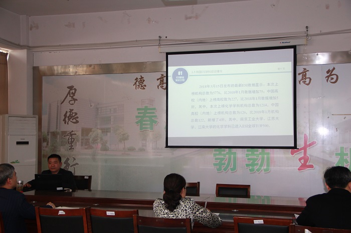李明副馆长首先就ESI基础知识、化学学科ESI情况和化学学科论文情况做了详细的介绍,并指出ESI评价指标是学科建设中的一个极其重要的参考指标。会上,李明副馆长对于化学学科ESI排名提升,针对性的提出几点建议。他鼓励老师凝练学科研究方向,加强相互合作、重视综述性论文的撰写。