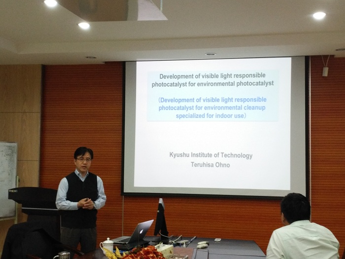 横野教授介绍了由水热法和化学蚀刻技术调控二氧化钛型光催化剂的表面形貌,提高光催化的反应活性,利用双光束光声光谱解释反应机理,以及光催化剂在工业上的具体应用。