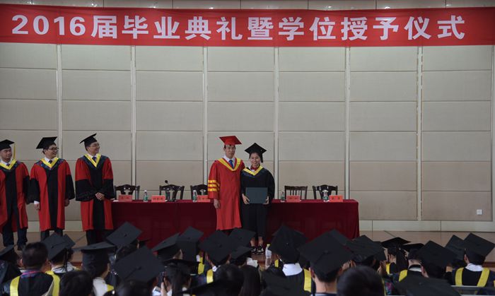 毕业典礼在庄严的国歌声中拉开序幕。学位授予仪式上,葛世伦为2016届学生拨穗正冠、授予学位,并与每位毕业生留影。