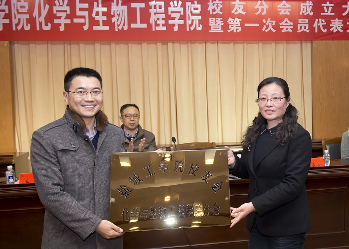 方海林向化学与生物工程学院校友分会授予铜牌,她指出,校友是学校最宝贵的资源和财富和值得信赖的力量,尤其是化生学院的校友,在化工领域中发挥着重要的作用。她希望化生学院通过校友分会这一平台,精心谋划,完善校友工作网络,挖掘校友资源,推动校友工作的有序发展。