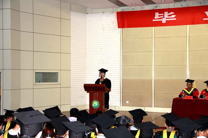 毕业生代表、考取华东理工大学硕士研究生、制药152班于敬华同学发言。她讲述自己和身边同学奋斗的故事,她认为奋斗是坚定远大的目标、是日复一日的坚持、是团结一心的合作,盐工带给她的是扎实的知识技能和永久奋斗的精神,全体毕业生将带着这种精神开启新的旅程。