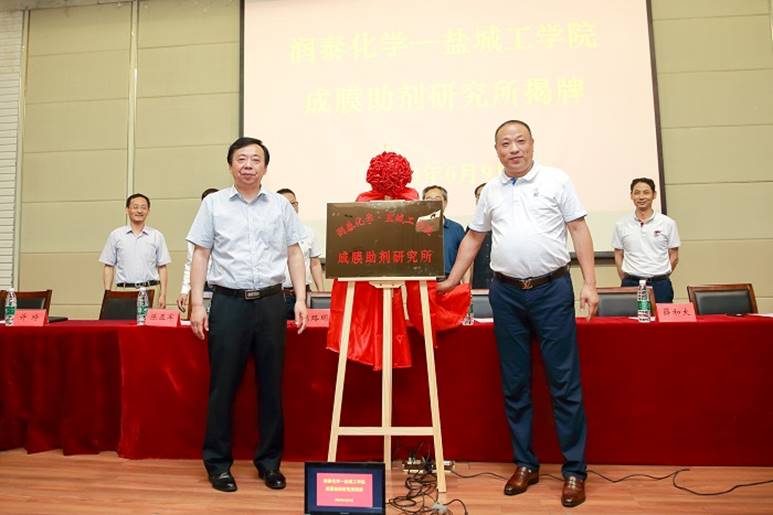 丁成处长与张世元董事长签订《校企合作协议》,副总裁薛和太和陈松教授签订《共建研究所协议》。王路明副校长与张世元董事长共同为“润泰化学betway西汉姆联官网成膜助剂研究所”揭牌。