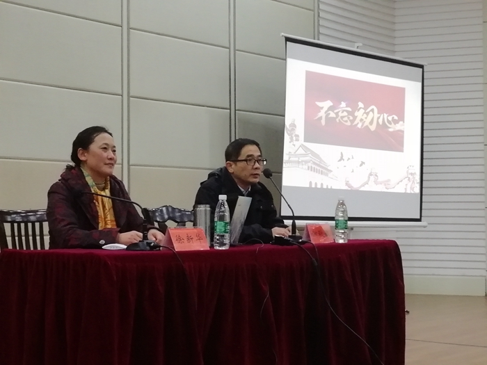徐新华从十九大的成果简介、十九大报告的新观点、新论断、贯彻好落实好党的十九大精神三个方面进行了宣讲。宣讲会中,徐新华通过互动游戏的方式教育学生应该坚定文化自信,推动社会主义文化繁荣昌盛,争当新时代先锋。她提出,学习和落实十九大精神,不忘初心是关键,当代大学生要做好十九大精神的宣传者和实践者。她鼓励与会同学提早规划人生目标,努力奋斗,不忘初心,砥砺前行。