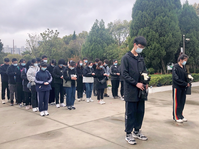 松柏苍翠,陵园肃穆,革命英雄纪念碑巍然耸立。祭扫活动在庄严的国歌声中拉开了序幕,伴随着《献花曲》,团员代表张艺涵、张伟楠向烈士献花,全体人员肃立默哀致敬并重温入团誓词,表达了年轻的大学生们继承革命先辈光荣传统,踏着烈士足迹前进的志向。随后,全体人员怀着无比崇敬的心情依次瞻仰烈士陵园,追忆先烈们的音容笑貌,缅怀先烈们的丰功伟绩,寄托对革命先烈的无限哀思,让英雄不朽,让精神长存。