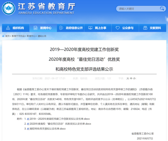 近日,江苏省2019—2020年度高校党建工作创新奖、2020年度高校“最佳党日活动”优胜奖和高校特色党支部评选结果公示,此次共评选出高校党建工作创新奖100项、“最佳党日活动”优胜奖140项、特色党支部100个。我院教工第一党支部被评为2020年度省高校特色党支部。